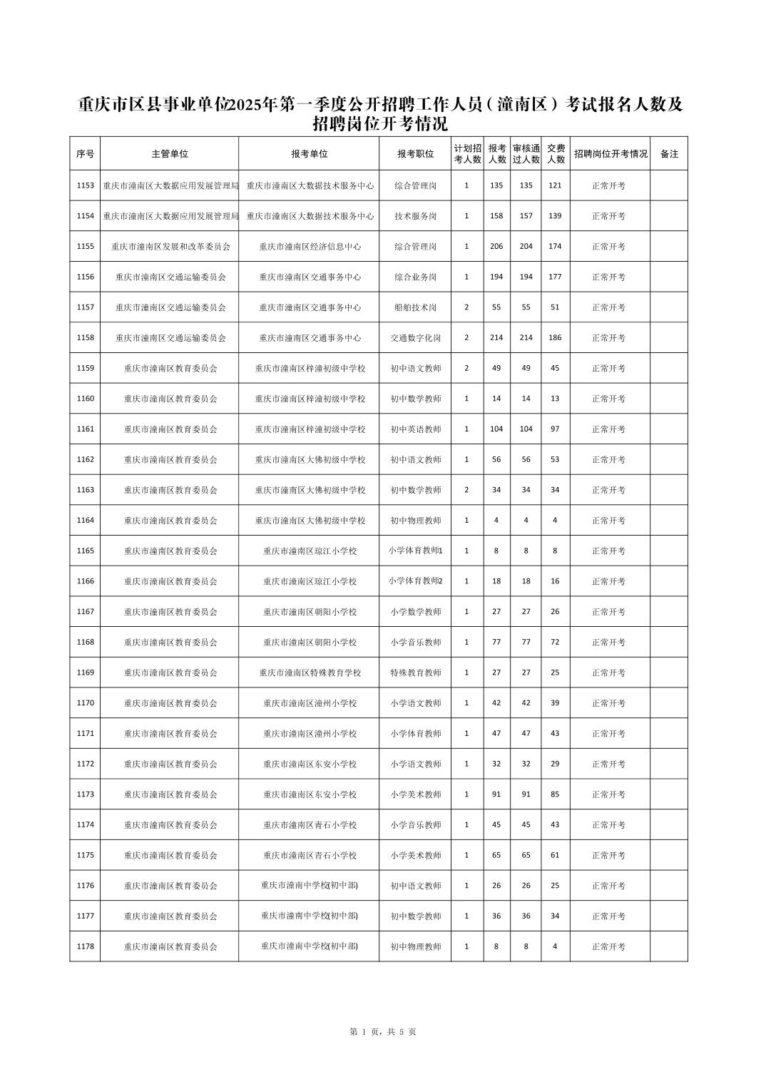 原標題:重慶市區縣事業單位2025年第一季度公開招聘工作人員(潼南區)考試報名人數及招聘崗位開考情況