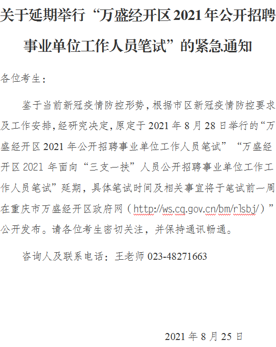 【導(dǎo)語(yǔ)】2021年萬(wàn)盛經(jīng)開(kāi)區(qū)公開(kāi)招聘筆試延期緊急通知現(xiàn)已發(fā)布,新公教育 為廣大考生整理此次公告內(nèi)容如下,望各位考生及時(shí)查看切勿錯(cuò)過(guò)報(bào)名時(shí)間。新公教 育為報(bào)考重慶事業(yè)單位考生提供備考資料、輔導(dǎo)用書(shū)、真題講義、筆試課程等內(nèi)容, 歡迎各位考生加入備考備考QQ群:949439669 一起學(xué)習(xí)!