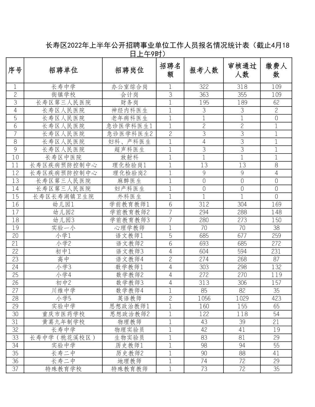 原標題:長壽區2022年上半年公開招聘事業單位工作人員報名情況統計表(截止4月18日上午9時)
