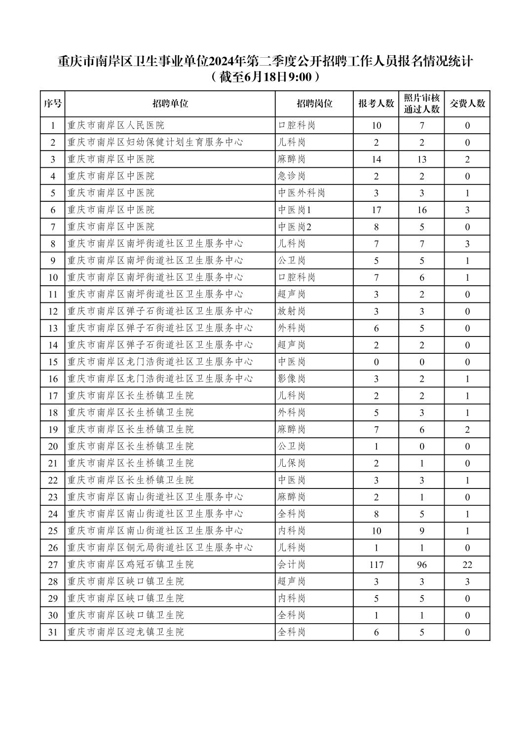 原標題:重慶市南岸區衛生事業單位2024年第二季度公開招聘工作人員報名情況統計(6月18日)