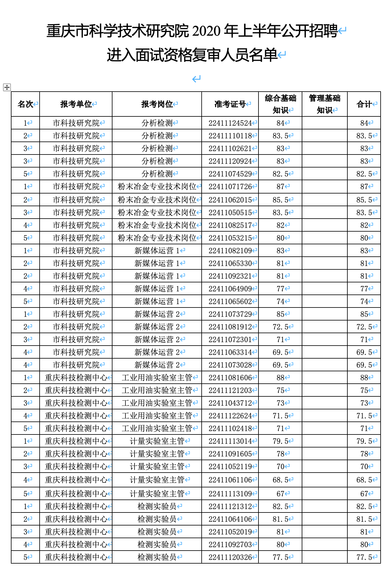 根據《重慶市2020年上半年公開招(選)聘市屬事業單位工作人員公告》要求,現將重慶市科學技術研究院公開招聘進入面試資格復審人員名單予以公示(附后)。公示時間:2020年8月3日—8月11日(7個工作日)。公示結束后10日內進行面試資格復審工作,面試資格復審具體事宜另行通知。