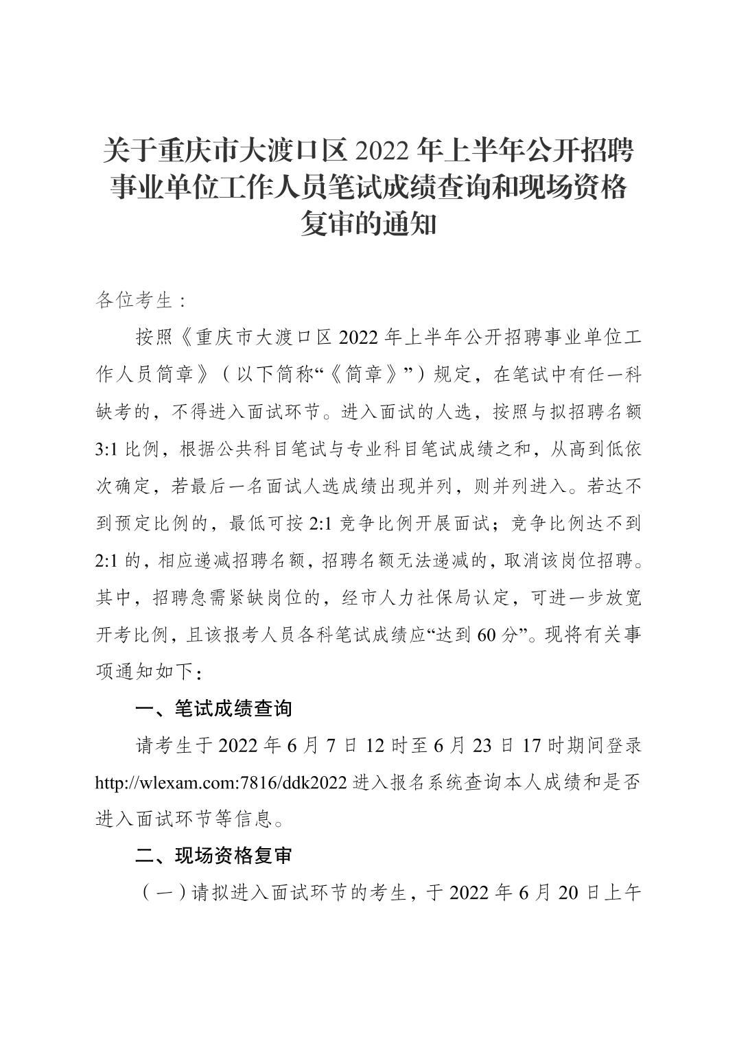 關于重慶市大渡口區2022年上半年公開招聘事業單位工作人員筆試成績查詢和現場資格復審的通知.pdf
