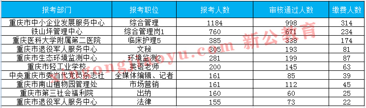 重慶事業(yè)單位招聘考試網(wǎng)為大家整理了本次考試報(bào)名人數(shù)最多的前十崗位。位居第一的依舊是重慶市中小企業(yè)發(fā)展服務(wù)中心的綜合管理崗。本崗位國(guó)民教育本科及以上即可報(bào)名,學(xué)歷要求低,并且不限專業(yè)、工作經(jīng)歷,也沒(méi)有專業(yè)科目的考試,面試形式為結(jié)構(gòu)化,因此報(bào)考人數(shù)較多,成為熱門崗位之一。相比19日的報(bào)名數(shù)據(jù)來(lái)看,排名前五的崗位沒(méi)有變化,重慶市退役軍人服務(wù)中心擠進(jìn)前十,而重慶紅巖聯(lián)線文化管理中心基建管理一職下降至11名。