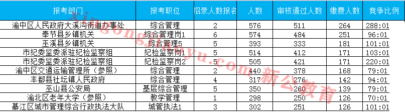 昨日過審人數最高的奉節縣鄉鎮機關-綜合管理崗1今日過審人數排在第二,過審率84.3%,高出平均過審率1%。渝中區人民政府大溪溝街道辦事處-綜合管理崗位目前過審人數最多,過審率高達88.7%,同時其競爭比例也排在第二。渝北區老年大學(參照)-教學管理過審人數跌出前十,但是其競爭比例(298:1)卻是目前最高的崗位。小編提醒還未報考的考生,可以多關注下競爭壓力較小的崗位,理性選擇崗位。