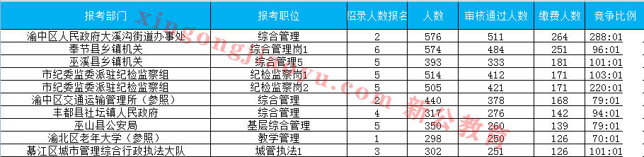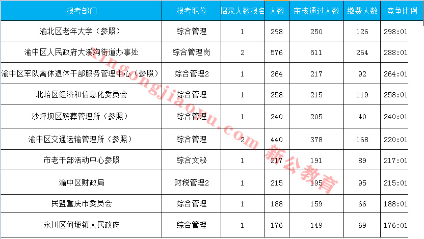 截至27日14:26,競爭比最高的是渝北區老年大學(參照)一職,招錄1人,報名人數為298人,競爭比例達298:1,本崗位屬于三不限,本科學士及以上即可報名,而且工作地點在主城區范圍,因此報考的人數相對較多。緊跟其后的是渝中區人民政府大溪溝街道辦事處,招錄2人,報名576,報錄比為288:1。