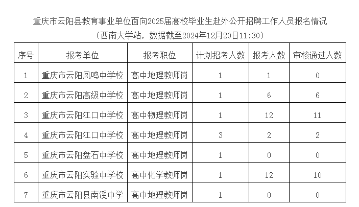 原標題:重慶市云陽縣教育事業單位面向2025屆高校畢業生赴外公開招聘工作人員報名情況 (西南大學站,數據截至2024年12月20日11:30)