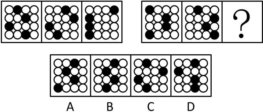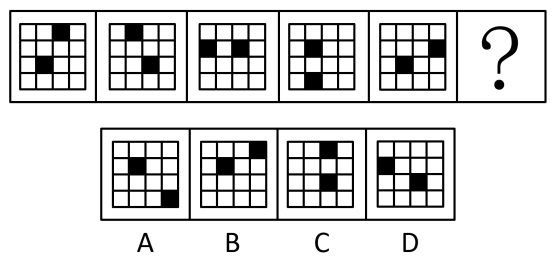 【解析】題干每幅圖均出現了4個黑圓,我們可對其分別研究移動軌跡。觀察第一組圖發現,第一行的黑圓每次向右移動一格,第二行的黑圓也是每次向右移動一格,且到了“終點”后則從頭開始,第三行的黑圓保持原地不動,第四行的黑圓每次向左移動一格。將此規律用于第二組圖,只有D項符合。故本題答案為D項。