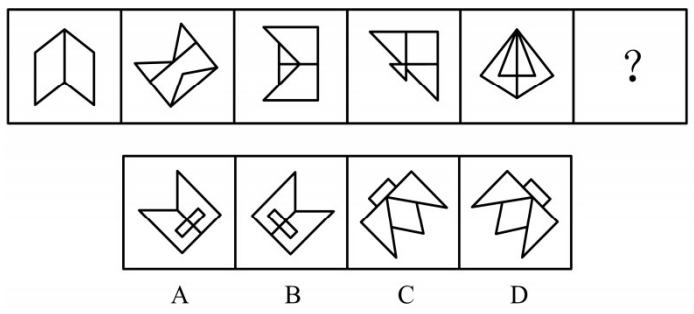 【解析】答案:C項。前五幅圖形中,后面一幅圖形的對稱軸由前一幅圖形的對稱軸逆時針旋轉45度得到,可以排除B、D兩項。再觀察,奇數項圖形的對稱軸和圖形中的一條線重疊。偶數項圖形的對稱軸經過圖形的幾個交點,故排除A項,選擇C項。