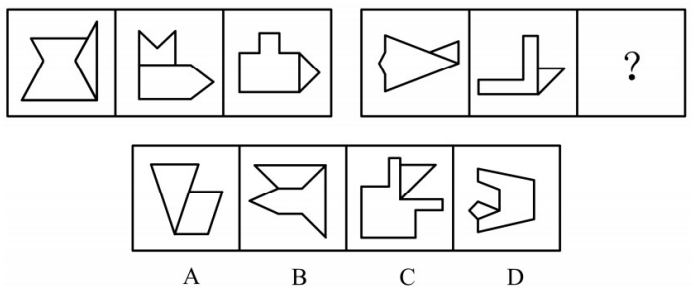 【解析】答案:D。第一組三幅圖,每幅圖中的兩個小圖形對稱軸相互垂直。第二組三幅圖,每幅圖兩個小圖形對稱軸相互平行。選項中只有D項兩個小圖形對稱軸相互平行,可選。